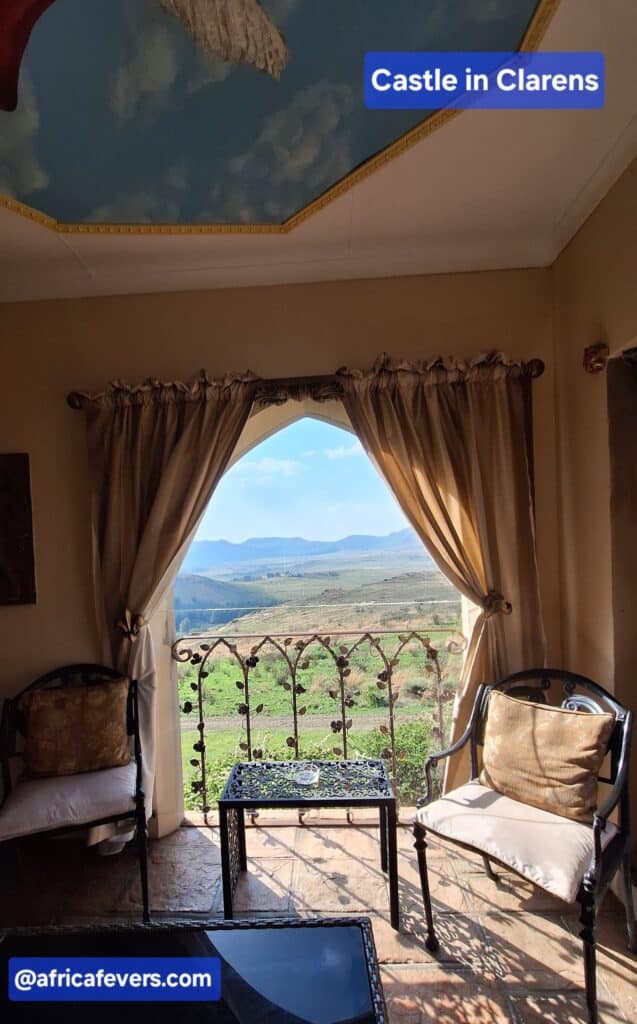 The castle itself is perched on a small hill just outside Clarens, in the Eastern Free State, with wide open fields all around. The closer you get, the more you see of the mountains in the distance: those are the Maluti Mountains, stretching toward Lesotho, and from where you can visit the breathtaking Golden Gates Highlands National Park.