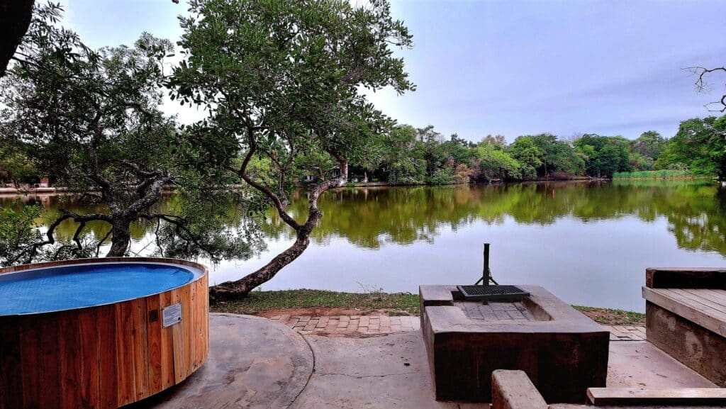 The camp overlooks Lake Jozini, with the Lebombo Mountains in the background. It’s a paradise for birdwatchers, and even when you’re just sitting quietly, there’s always something moving: birds, antelope, or a distant hippo snorting from the water. On hot days, we even used our wood-fired hot tub as a plunge pool to cool down.